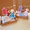 The doll is wearing a double-sided dress, so you get two different styles. The dress closes in the back with a hook and loop tape, it's very easy to put the dress on and off. The doll can sit, does not stand without support